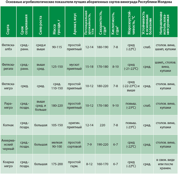 Многие технические сорта высокоурожайны и предназначены для производства сухих вин и коньячных виноматериалов – Фетяска-албэ, Фетяска-регалэ, Фетяска- нягрэ, Рара-нягрэ, Копчак, Аккерманский черный, Каушанский черный, Тельти курук, Гордин и другие. Из столовых сортов выделяются Коарна-нягрэ, Коарна-албэ, Алимшак, Калабрес, Альварна, Цыца капрей, Бикан и другие. У большинства других местных старинных сортов, согласно публикациям, отмечаются посредственное качество вин, слабая устойчивость к морозам и грибным болезням (Плавай, Кабасма, Галбина, Кабассия черная, Сгигарда, Турба и другие). Многие из отмеченных сортов лучше проявляются в купажных винах.