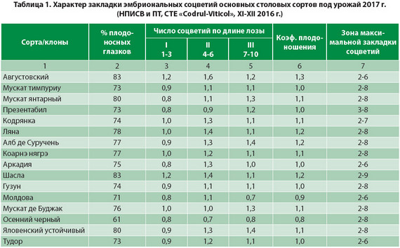 Показатели эмбриональной плодоносности у большинства возделываемых в Молдове сортов под урожай 2017 г. удовлетворительные и соответствуют биологическим свойствам сортов и клонов (таблица 1).