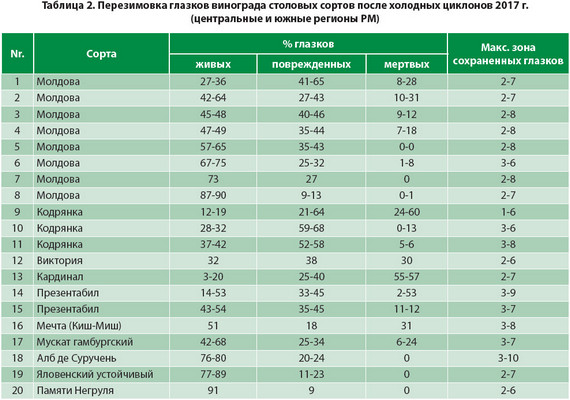Столовые сорта являются достаточно проблемными, т.к. часто мерзнут, требуют расходов на их восстановление и резко снижают эффективность от хозяйственной деятельности. Особенно классические (Кардинал, Королева виноградников и другие) и ряд сортов новой селекции (Кодрянка, Виктория, частично Молдова и т.д.) являются слабозимостойкими. Они почти повсеместно размещены на очень богатых почвах равнинных плато или на нижних частях склонов. Это отрицательно сказывается на их перезимовке в принципе, в том числе в 2017 г.