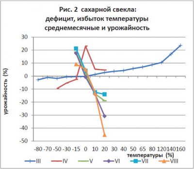 Месяцы летнего сезона (рис.2). Характерным для растений сахарной свеклы является их последовательно отрицательная (и сильно акцентированная) реакция на тренд повышающихся температур всех 3-х месяцев летнего периода (правда, выраженная в разной степени).