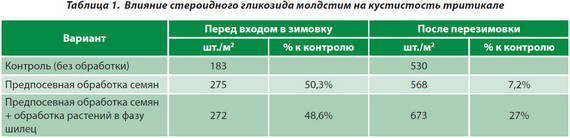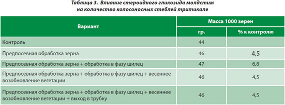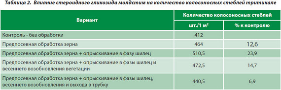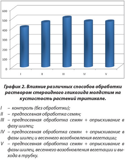 Как следует из данных, представленных в таблице 1, предпосевная обработка семян тритикале препаратом молдстим способствовала более активному росту и развитию растений в период осенней вегетации. Кустистость растений в результате применения гликозида превышает контроль на 50,3%. Хотя дополнительное опрыскивание растений тритикале в фазу шилец и не приводило к существенному повышению количества стеблей на растении перед входом в зимовку, оно способствовало лучшей перезимовке и росту стеблестоя в зимне-весенний период (табл. 1). Количество стеблей, полученное от дополнительной обработки в фазу шилец, превысило контроль на 27%.