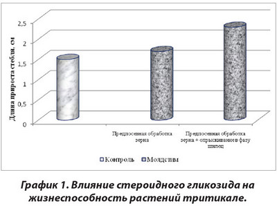 Материалы и методы. В качестве объекта исследования был взят озимый сорт тритикале Ingen 33. Предпосевную обработку семян и растений проводилась раствором стероидного гликозида молдстим, экстрагируемого из измельченных семян перца сладкого Capsicum annuum 70% метиловым спиртом с последующей хроматографической очисткой гликозидного экстракта на колонках с силикагелем. Фракция выпаривалась досуха и получался целевой продукт. Препарат молдстим включен в государственный регистр «Registrul de Stat a Produselor de Uz Fitosanitar şi al Fertilizanţilor» для применения в Республике Молдова.