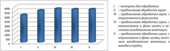 Предпосевная обработка семян тритикале с последующим опрыскиванием растений в начале возобновления вегетации и в фазу выхода в трубку не оказали существенного влияния на ростовые и формообразовательные процессы. Не отмечены достоверные отличия средней массы 1000 зерен по вариантам опыта. Вместе с тем необходимо отметить, что наивысшая эффективность получена на участке, где проведена дополнительная обработка растений в фазу шилец на 25 дней после массового появления всходов (таблицы 3).