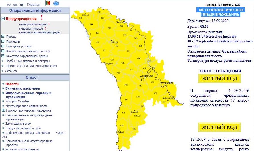 В то же время, до 25 сентября в стране действует «желтый код» в связи с чрезвычайной пожарной опасностью (V класс) природного характера, а до 21 сентября действует гидрологическое предупреждение в связи с низкой водностью: на малых реках бассейна нижнего течения р. Реут, бассейнам рек Бык, Ботна, Когильник, Ялпуг и Кагул сохраняется оранжевый код опасности.