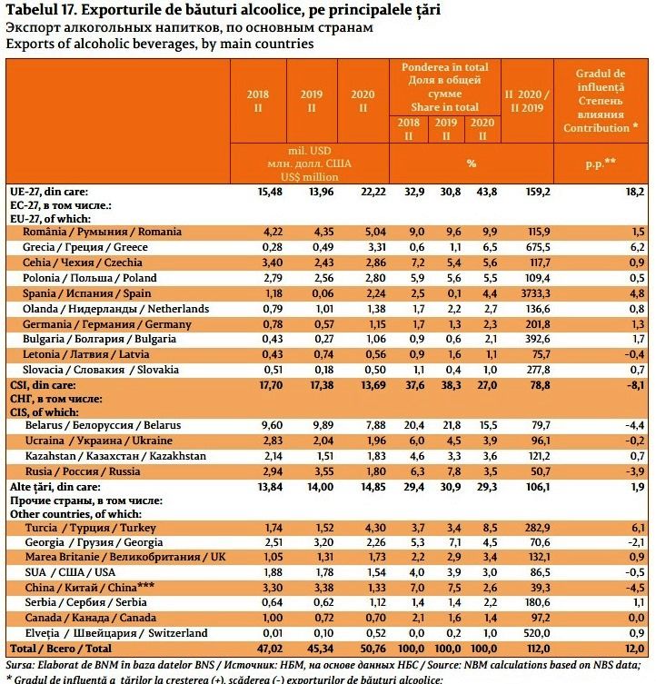 Согласно Платежному балансу Национального банка Молдовы (НБМ), такое развитие событий в основном связано с увеличением примерно вдвое экспорта неденатурированного этилового спирта, в то время как экспорт виноградных вин сократился примерно на 12%, пишет mold-street.com