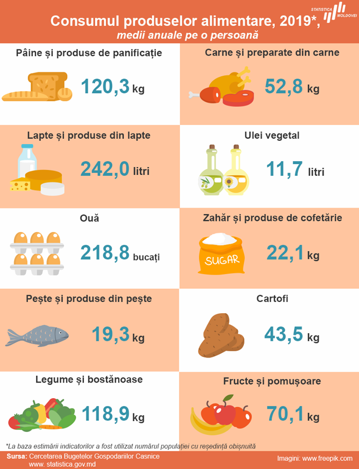 Национальное бюро статистики (НБС) опубликовало информацию о том, какие продукты и в каком количестве в среднем съедает гражданин Молдовы в год.
